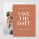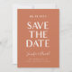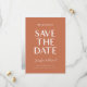 Modern och enkel spara datumkortet med ett blockerat teckensnitt som säger "spara datumet" på en terracotta-bakgrund. Du kan lägga till ett foto på baksidan.