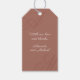 Den här elegant bröllop-favorittaggen är ett bra val för att använda på favoriter, gåvor och semesterdagar i bröllop, förlovningsfest, årsdag party eller dusch. Den har en enkel, modern, minimalistisk design, vackra kalligrafskript som monogram av bruden och trippen på alternativa hörn. Ett tack till ert budskap och till bruden och brudgummens namn är inriktade på en jordisk terrakotta-bakgrund med elfenartad text. Ersätt exempeltexten med önskad text eller behålla med samma enkla meddelande. Var noga med att personalisera namn och monogrammet initialer. Du kan flytta initialer lite lämnat eller höger, uppåt eller nedåt för att anpassa den bästa visningen i det här designformatet genom att välja "Redigera med designmall" som finns grund i textmallen. Då öppnas redigeraren för fullt och du kan visa varje lagrar i designen, markera allt du vill flytta och dra den till ställe. Monogrammen ser bäst ut när de springa något utanför kant. När du anpassar designen i textmallen kan du öppna redigeraren för fullt genom att välja "redigera med hjälp av verktyg" grund i textmallen. På så sätt kan du markera det stora monogrammet initialer och dra det till ställe längs kant.