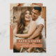 Elegant boho bröllop spara datum-kort med ett foto av briden & groom, monokromatiska jordtonsrutor med en redigerbar textmall. På motsatt sida finns en terracotta-bakgrund med vattenfärgad ökentorkad handflatan löv och trendig pampas-gräs.
