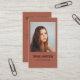 Create a stylish and memorable first impression with this modern terracotta photo business card, designed for photographers and creative professionals. The warm earthy tone adds a trendy, elegant touch while the front showcases your portrait photo and the back includes neatly organized contact details, social media icons, and a scannable QR code for instant portfolio access.