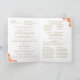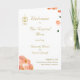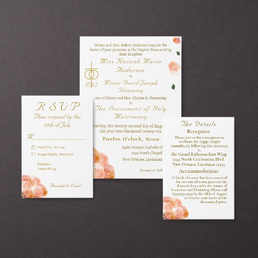 Utformningen omfattar den traditionella symbolen kor & ringar för giftermål i det övre lämnat hörnet. Anpassadets rubrik visas i ett elegant Nuptial-teckensnitt som visar namn av Bride och Groom. Här nedan visas även datum och namn i kyrkan. Vackra bilder av persiko- och terracotta-färgad ro är en ära för hörnen. Inuti finns det traditionella formatet för ett katolskt bröllop. Baksidan täcker visningarna på det foto du ger tillsammans med tacksamhetsmeddelandet. All text är anpassade. Det finns plats för upp till sju brudgummar och marskalkar. Designad för samordning med "Terracotta Ro katolska Bröllop Suite".