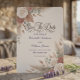 Announce your special day with earthy warmth and elegant floral charm, featuring an inviting blend of burnt orange, muted clay, and delicate greenery.This design centers on an asymmetrical composition of warm-toned dried palm elements, wheat stems, and lush eucalyptus foliage, creating a natural frame around sophisticated serif and flowing script typography. The color palette masterfully balances deep burnt orange and peach hues against a soft cream background, utilizing shading and light to create visual depth and a soft, painterly aesthetic.This is a flat printed image with a watercolor botanical texture effect, not actual raised material.