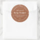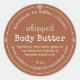 Terracotta Script Handgjord Kroppsmjukkräm Etikett rund dekal med en mjuk terrakotta bakgrund med vit script och serif typografi. Designen presenterar tydligt ditt företagsnamn, produktnamn, ingredienser och vikt i ett rent, lättläst format som känns både handgjort och professionellt. Perfekt för ekologiska hudvårdsburkar, förpackningar för vispad kroppssmör, höstkollektioner, presentaskar och varumärkning för småföretag. Lätt att anpassa med dina uppgifter.