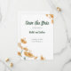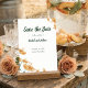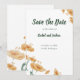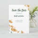 Meddela din speciella dag med den otvungna elegansen hos detta bohemiska "Save the Date"-kort. Med ömtåliga akvarellvildblommor i varma persikotoner och mjuka orange nyanser, vackert inramade av jordnära grön typografi.