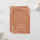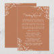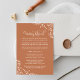 Skapa en varm och jordnära ton för din repetitionsafton med denna terrakotta-färgade inbjudan till repetitionen och middagen. Vita sirliga detaljer och elegant kalligrafi inramar en charmig rimmad dikt som guidar gästerna genom repetitionen av ceremonin och den festliga middagen. Den rika terrakotta-bakgrunden ger en rustik men ändå förfinad värme som är perfekt för höst- eller ökeninspirerade firanden. Anpassa all text, färger och layout för att passa din stil.