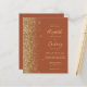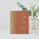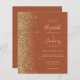 Den vänstra kanten på denna eleganta moderna bröllopsinbjudan har en falsk guldglitterkant. Den anpassningsbara texten kombinerar blek guldfärgad handskrift, kopparplåt och kursiva stilar på en terrakotta bakgrund. Baksidan ger utrymme för bröllopsdetaljer på en solid terrakotta bakgrund, tillsammans med en QR-kod som gästerna kan skanna för att besöka er webbplats och svara.