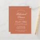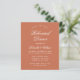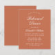En enkel inbjudan till repetitionsmiddag med en modern färg: terrakotta (en rödbrun nyans). Den har bara vit text på terrakotta bakgrund. Orden "Repetitionsmiddag" och namnet är skrivna med ett elegant kalligrafiskt typsnitt.
