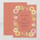 Denna design har en varm, jordnära terrakottabakgrund som sätter en livlig ton för ett säsongsbundet evenemang. Ett frodigt arrangemang av akvarellblommor, inklusive gyllene gula rosor, mjuka rosa blommor och delikat grönska, accentuerar kompositionen. Paletten av korall, amber och rodnad skapar en glad och romantisk stämning perfekt för en utomhus- eller öken-ceremoni. Handmålade botaniska detaljer ger en konstnärlig, högkvalitativ känsla till den övergripande estetiken.