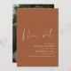 Med alla pandemirestriktioner och säkerhetsprotokoll, informera dina vänner och nära och kära om din nya bröllopsdag med detta moderna minimalistiska annonskort som säger ”nytt datum” med kalligrafistil och terrakottafärgtema. Du kan också anpassa fotot på baksidan.