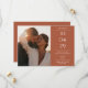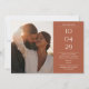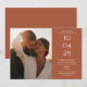 Ett modernt minimalistiskt save-the-date-kort med ditt speciella datum, foto och bröllopsdetaljer i klassisk, chic typografi på en terrakotta-bakgrund. Designad av Thisisnotme