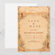 Skapa scenen för en romantisk ökenfirande med denna raffinerade västerländska bröllopsdesign, med en varm terrakottapalett, mjuka vintage-texturer och ett vackert illustrerat landskap ramad av ömtåliga blommor och kaktusar. Den subtila ökenvignetten tillför djup och berättande, vilket skapar en inbjudan som känns både konstnärlig och tidlös.