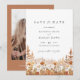 Få din annons att kännas personlig och förfinad med detta terrakotta-foto med vilda blommor i bergen för "spara datumet". En varm boho-palett, luftigt vitt utrymme och modern minimalistisk typografi skapar en raffinerad look som fungerar vackert för utomhus-, rustika och destinationbröllop.