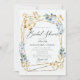 En elegant terrariumgeometrisk guld ram gräns inbjudningskort för möhippan med guld-skiktad utformning av geometriska fjärilar från ramar och guld (digitala effekter) med blå eucalyptus bladverk, samt modern kalligrafi på modern elfenbensbakgrund. Elegant och chic, det är perfektens inbjudan till en formell, traditionell möhippa med en aning vismisk, eller en möhippa vid trädgården, brunch eller party för en brud som kärlek boho och fjärilar.