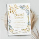 En elegant terariumgeometrisk guld ram Sweet 16-inbjudan med en guld-skiktad utformning av geometriska fjärilar från ramar och guld (digitala effekter) med blå eucalyptus foliage, samt modern kalligrafi på modern elfenbensbakgrund. Elegant och chic, det är perfektens inbjudan till en elegant firande med en gnutta vismisk eller en möhippa vid trädgården, brunch eller party för en tonåring som kärlek boho och fjärilar.