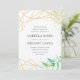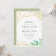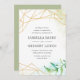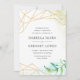 Vår terrariumsamling ramar er bröllop-information med ett intrikat gräns av guld geometriskt inslag accentuerat med lush vattenfärgsbotaniska löv i grönten i nedre högerna. Bröllopsinbjudningar som går tillbaka till en vattenfärg tvättar mönster i skuggor av blått och grönt.