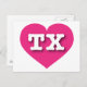 Detta vykort har ett livfullt lila hjärta som innehåller de feta, vita, versala bokstäverna TX, den officiella förkortningen för Texas, ensamstjärnans delstat. Baksidan av vykortet är tomt och väntar på din personliga text eller handskrivna hälsningar.