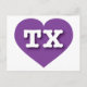 Det här vykortet har ett pulserande lila-hjärta som innehåller det feta, vita, övre fodral brev TX, förkortningen officiell för Texas, Lone Star-tillståndet. Baksidan av vykortet är tom och väntar på personligens text eller handskrivna känslor.