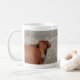 Bilder av cowboyers samlare boskaps kom kommer att tänka på med detta foto av en Texas Longhorn-ko. Hon har lyft huvudet från bete och slickar näsan som stirrar konstigt medan hon står på det torra gräsmattan. Ett underbart mugg för alla som kärlek ett westernt tema från en kova till en boskapsskötare till den där stadshusen som längtar efter att vara ute på en boskapsög som sover under stjärnorna. Djur älskare av alla slag kommer också att uppskatta den nyfikna kon. Hon är förtjusande.