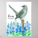 En poster som dekoreras med en grått-mockingbird på ett inlägg med blommande blåblommor som ritats med bläck och målats med vattenfärg. Inspinerad av Texas statliga fågel och statsblomma.