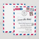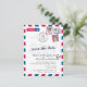 Ett roligt och kreativt "Spara datum"-kort för bröllop att skicka till alla dina gäster för att presentera er destination bröllop. Utseende som gammalt flygresear i rött och blått med karta över USA. Två hjärtan markerar städerna Austin, Texas och San Fransisco, Kalifornien och binder samman dem. Lägg till tre av dina favoritfoton som frimärken.