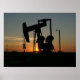 Fotografi av en oljepump som silhuetterats av himlar nära solnedgången i Texas på landsbygden.