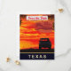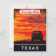 Texas, spara datum bröllopsinbjudan, reser postkort. Pickup lastbil på vägen vid solnedgången.