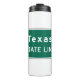 Grönt och vita vägskyltar för "Texas State Line" kan ses på Texas allmänna motorvägar och motorvägar.