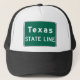 Grönt och vita vägskyltar för "Texas State Line" kan ses på Texas allmänna motorvägar och motorvägar.