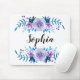 Mousepad med romantisk design för kran för blått- & lilavattenfärg blom- och den anpassadenamn eller monogramen.