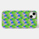 Mönster av kalkgröna aloe vera-växter i blåa krukor med lila bakgrund.