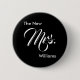 Du kan anpassa den här "nya fru"-knappen med bridens nya efternamn. Mrs. förekommer i ett vitt skript (typografi). Knappen är svart.