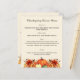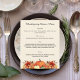 Cream colored background decorated with orange fall flowers and pumpkins. Personalize and add your Thanksgiving menu on the front.