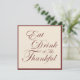 Den här eleganten och trendigets typografi Thanksgiving Inbjudan till middagen party eller luncheon, på höst färger om ecru och kastanj, lyder: Mat Drink och Var tacksam. Det finns ett matchande kuvert och porto.