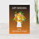 Ett kort för Thanksgiving med en vacker jug av blommor "från vårt hem till ditt", i ljust, varmt färg! Orangen, gulten, de röda och vita blommorna är i en vit jug, med ord, " Ge tack" på den med ljusblå bokstäver. Hälsning är "HAPPY THANKSGIVING" överst och "från vårt hem till Yours!" nedanför blommorna, med vit text på en mörk brun bakgrund som bleknar till rostig orange vid grund. Det inre meddelandet är bara ett förslag och du kan enkelt ändra det eller ta bort det helt om du vill.