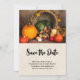 Spara datumkortet med ett foto av en thanksgiving skörd, som sätts på en rustisk trä bord. Pumpkin, potatis, squash osv.. utgör den här krävande matsamlingen. Färglöst höst löv omger kornuskopa basket.