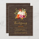 Thanksgivingens middagsinbjudan på papper budget. Skenbara blommor och vit pumpa i vattenfärgsmotif med höst löv och skript text på bakgrunden av rustiskt trä. Klicka på Anpassa om du vill ändra text eller bakgrund färg.