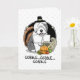 Gobble...Gobble... Gobble Happy thanksgiving Old English Sheepdog - Lusnyj OES-hund klädd i en Thanksgiving middag Pilgrim costume med cornucopia, frukts och grönsaker, Pilgrim hatt, Pilgrim collar och kalkonfjäder svan. Copyright © Angi Laframboise. Cute helgdag tecknad-gåvor för hundälskare.