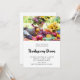 En inbjudan till Thanksgiving-middag med ett fotografi av Thanksgiving-helgens tradition. Ett bord dukat med överflödshorn, skördegrönsaker och frukter.