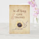 En solrosa ses på kortets nedre del på en texturerad bakgrund av tittar i varma toner. I mitten finns ord: "I sak tackar vi ge" i ett blandat teckensnitt. Berätta för dina vänner och din familj att du är tacksam för dem med det här Thanksgivingen för religiösa.