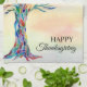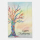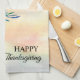 Kökshandduken i Happy thanksgiving har en färgstark mosaikfamilj träd på vattenfärgad bakgrund. Texten är anpassade. Gör en underbar värdinna-gåva. Original Mosaic and Watercolor © Michele Davies.