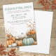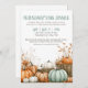 Inbjudan till Thanksgivingens middagsfest. Inbjudan era vänner att samlas och ge tack vare denna mysiga och festliga inbjudan till vänner. Utformningen har en mjuk höstpalett med en blandning av tealblått och brunt typsnitt i både serif och script stilar för ett varmt och snyggt utseende. Vid grund anger en charmingpumpspatchscen tonen med en blandning av orange, tealblått eller sjöskumma gröntar och vita pumpor för ett unikt fall. Den övergripande designen blandar rustik charm med ett klick oväntat säsong färg. Perfekt för en avslappnad eller en formell "Friendsgiving"-sammankomst, och texten kan enkelt ändras så att den blir värd för en vanlig Thanksgiving-middag i stället. Den här inbjudan är fullt anpassade och tillgänglig som ett utskrivet kort eller en hämtningsbar digital fil för e-post eller utskrift lokalt.