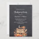 En faux rustic chalkboard som bakgrund. Dekorerad med pumpor, köksredskap, ett rustiskt trämärke med texten: Thanksgiving Feast. Anpassa och lägg till information om party.