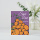 Inbjudan dina gäster på Thanksgivingen sparar datuminbjudan på vykort med en konstnärlig teckning av höstpumpor på en vindruva med lila bakgrund. Alla dina middagsdetaljer kan vara lätt personlig på baksidan av vykortet. Happy thanksgiving!