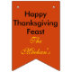 Festive Thanksgiving bunting banderoll med 16 Flaggor till visning utomhus för roligt under fall och Thanksgiving, eller inomhus på en kamermantel osv. Ge tack är skrivet i svart text på en gyllene gult. Centrum för buntning har ordalydelsen Happy thanksgiving Feast i svart text och Familjen Namn i gult på orangens röda bakgrund. Anpassa med ditt efternamn för familjen. Söt höst löv med gyllene gult och orange löv är i centrum för buntning med vacker tuplip poplar träd och andra påsar i skogen. Ändar av buntning av kötkalkoner med färglösa fjädrar och söt liten pumpa utomhus med kalkon, pumpa och löv anbringad. Behålla bilder, eller ta bort och ladda upp ditt eget för att anpassa det. Originalgrafik- och fotodesign av TamiraZDesigns på www.zazzle.com/tamirazdesigns