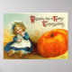 Vintagens Thanksgiving av en liten flicka i en blå klänning som håller en sked och tittar på en pumpa. I högernas övre hörn står det "Önskar dig happy thanksgiving".