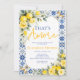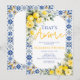 An elegant That’s Amore bridal shower invitation featuring a fresh watercolor lemon and yellow floral design framed with a classic blue Italian tile pattern. Inspired by Italian-themed bridal showers, this invitation combines bright citrus elements with soft yellow florals and timeless Mediterranean tile details for a romantic and stylish look.