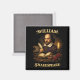 A classical painted portrait of William Shakespeare writing by candlelight, surrounded by books, parchment, and roses in a rich Renaissance setting.