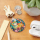 A vibrant cat with striking green eyes is surrounded by a lush array of colorful flowers and leaves. The use of bold hues like orange, teal, and pink creates a whimsical and enchanting scene.