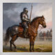 A knight in full armor sits on a horse, holding a lance. In the background, a group of soldiers watches intently under a cloudy sky.