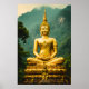 This image captures the reverence and grandeur of Thai Buddhist art. The Gilded Buddha is depicted in a deep meditative posture (Dhyana Mudra), radiating calm and light against a dramatic backdrop of the Thailand deep green jungle foliage and soaring, mist-shrouded limestone peaks. The rich gold of the statue, complete with the iconic spire (Ushnisha), offers a vibrant contrast to the natural, verdant landscape.